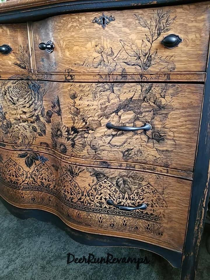 - Декупаж. Эта техника предполагает нанесение на поверхность мебели изображений или вырезок из бумаги или ткани с последующим покрытием их лаком. Декупаж может добавить интересные узоры, текстуры и изображения на вашу мебель.