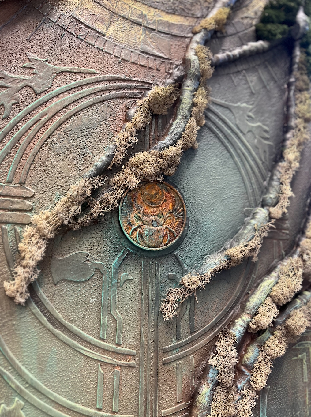 В работе постарались сочетать восточный и западный орнамент, добавили немного противостояний по цвету, эпохам и стилям, соединив их в пульсирующей мандале майянского календаря. Главный подход к работе - это разрыв указанных в битве шаблонов: восточный колорит цветов и переливов, смелые яркие акценты стали подложкой для классических и западных орнаментов, а западный приглушённый натуральный эко стиль вписался, как величественный и белоснежный Тадж-Махал в изящные оттиски восточного орнамента, где лишь намёком просачивается золотистая патина.