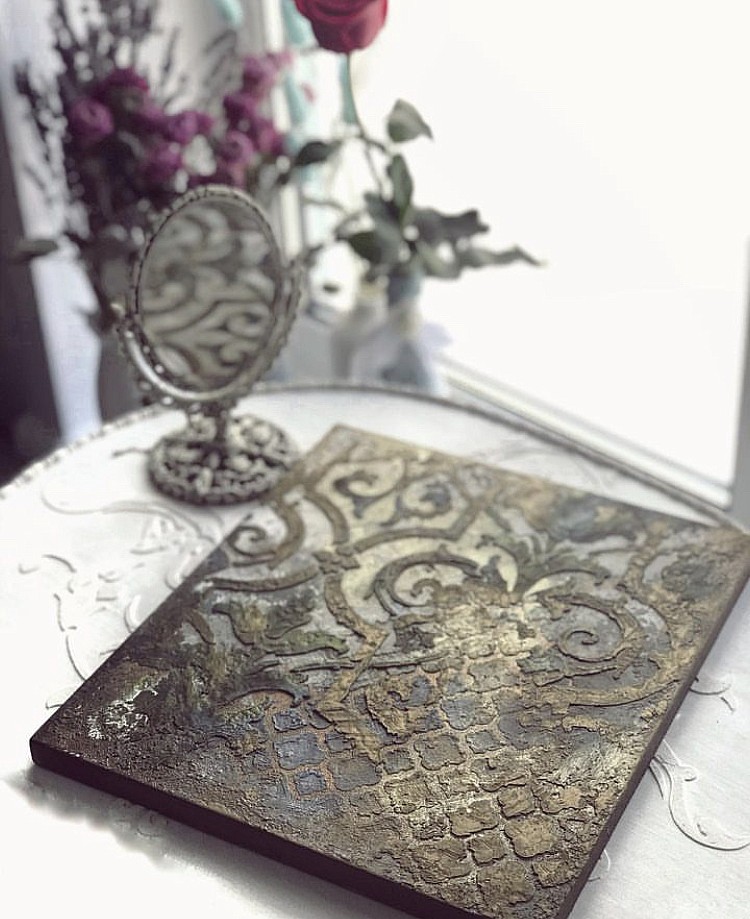 В прорези этого универсального инструмента удобно наносить краску различными способами: спонжем, круглой кистью или аэрографом. Трафарет легко вдавливается в глину, а также подходит для декоративной штукатурки. Для нанесения акриловых фактурных гелей наилучшим способом является использование шпателя, который также удобно использовать для удаления излишков краски без повреждения трафарета.
